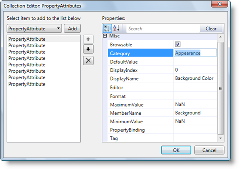 Locate the PropertyAttributes collection in the Properties window, and click the ellipsis button next to the item. The Property Attribute Collection Editor dialog box will appear.