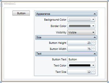<c1:C1PropertyGrid Margin="130,12,30,12" Name="c1PropertyGrid1" xmlns:c1="http://schemas.componentone.com/winfx/2006/xaml" SelectedObject="{Binding ElementName=TextButton, Mode=OneWay}"/>