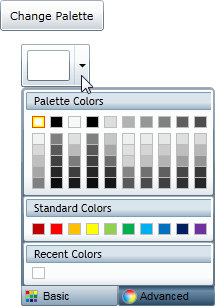 ColorPicker for WPF and Silverlight includes over 20 predefined color palettes that match the themes used in Microsoft Office. For more information about palette choices, see Available ColorPicker Palettes. To change the color palette, you can set the C1ColorPicker.Palette property.