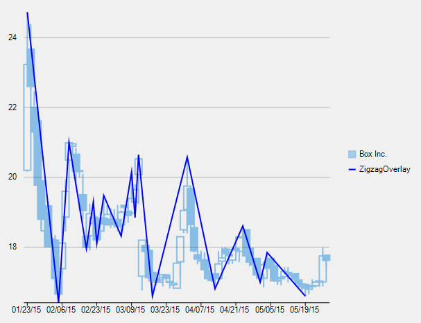 The following example considers stock data for a company Box Inc. over a period of time and plots zigzag overlay on the same financial chart, as shown in the image above. The example uses data from a JSON file, and DataService.cs class is created to access the JSON file.