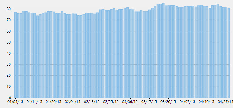 The ColumnVolume Chart is identical to the standard Column Chart except that the width of each bar is determined by the Volume value. The data for this chart type can be defined using the FinancialChart or FinancialSeries binding property as a comma separated value in the following format: "yProperty, volumeProperty".