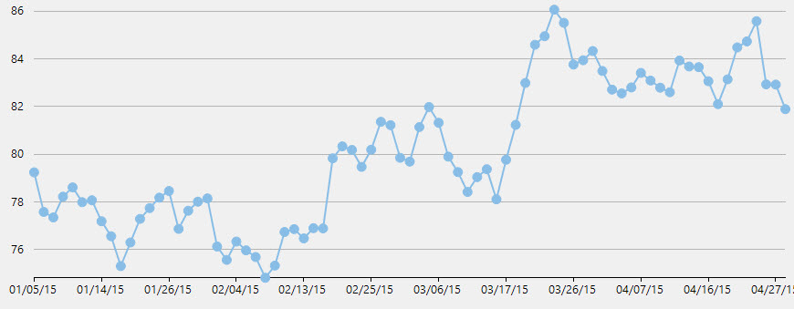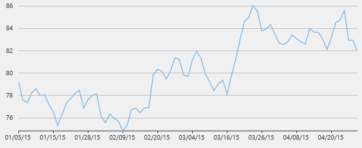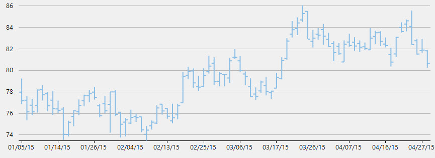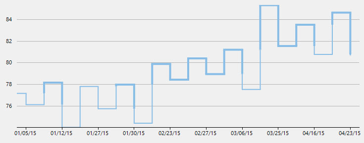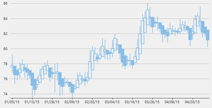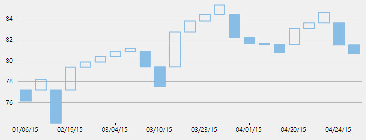 The size of the wick line is determined by the High and Low values, while the size of the bar is determined by the Open and Close values. The bar is displayed using different colors, depending on whether the close value is higher or lower than the open value. The data for this chart type can be defined using the FinancialChart or FinancialSeries binding property as a comma separated value in the following format: "highProperty, lowProperty, openProperty, closeProperty".