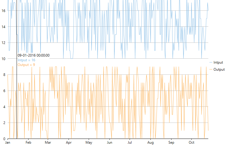 LineMarker displays the precise data values for a given position on the chart by dragging horizontal and/or vertical lines over the plot with an attached label. It is useful in scenarios, where a user has a lot of data in a line or area chart, or if a user wants to display data from multiple series in a single label. With built-in interactions, such as Drag and Move. a user can drag the line marker and more precisely select the data point on the chart.