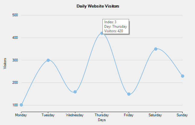 The following code compares and displays data of number of daily website visitors in a specific week. The code shows how to configure the ToolTipContent property to customize tooltip content.