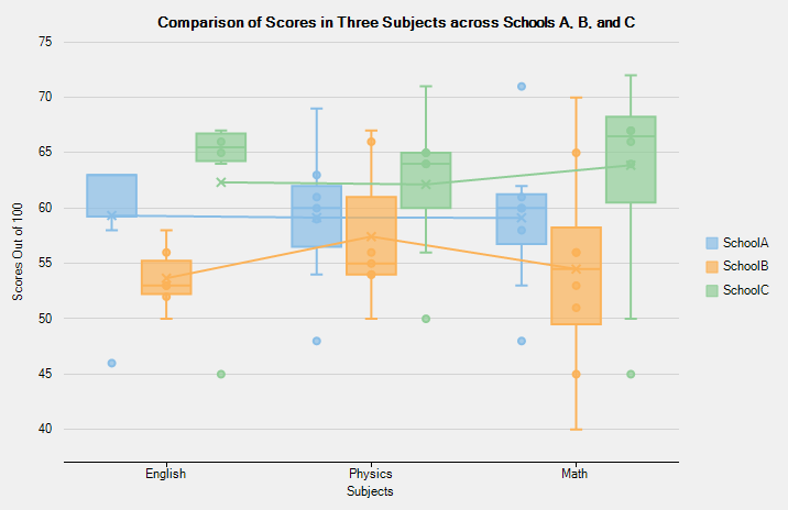 The following code uses data regarding scores obtained by students of schools A, B, and C in three subjects. The code illustrates how to implement Box-and-Whisker series in FlexChart.