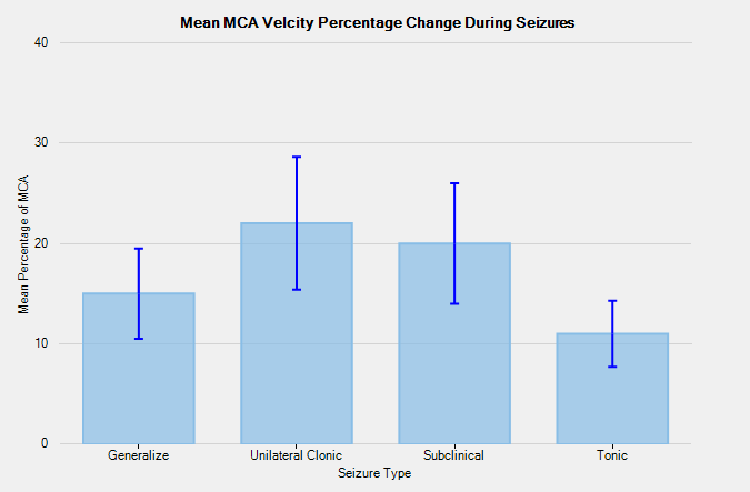 The following image displays Plus and Minus error amounts in the mean MCA (Middle Cerebral Artery) velocity data for different seizure types observed in children.