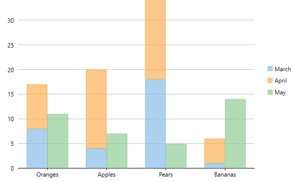 The following code compares fruit data for three consecutive months and shows how to implement stacked groups in FlexChart.