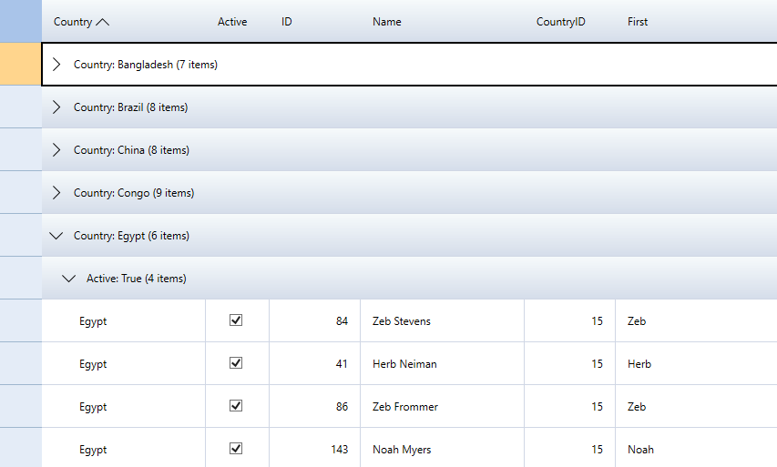 The following image shows data grouped by country and their active state. Users can click the icons on group headers to collapse or expand the groups, as they would do with a TreeView control.
