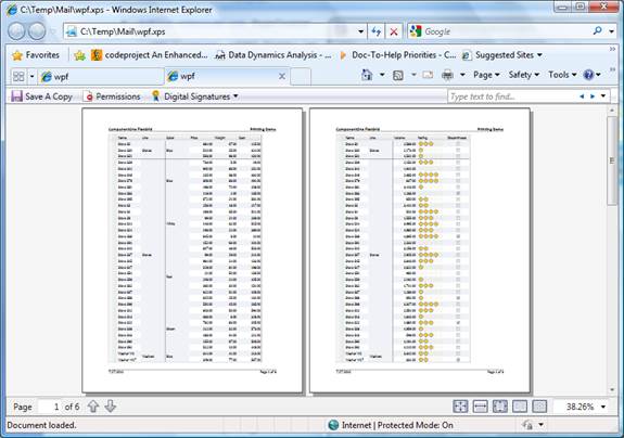The image below shows the document created when the grid is rendered into an XPS file. The image is very accurate, including a custom rating cell used in the sample. Row and column headers are automatically included in every page, as well as a simple page header and the standard “Page n of m” page footers.