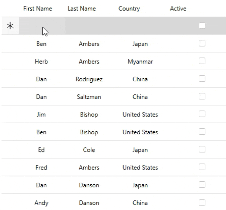 The following code can be used to display a new row template that lets you add a row in FlexGrid. This example uses the sample used in Quick Start topic.