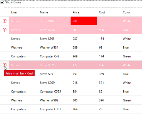ErrorStyle, RowHeaderErrorStyle, RowErrorStyle: These properties allow changing the appearance of the cells that either have errors directly or belong to a row that has errors. In addition, these styles are applied on top of the current style of the cell.