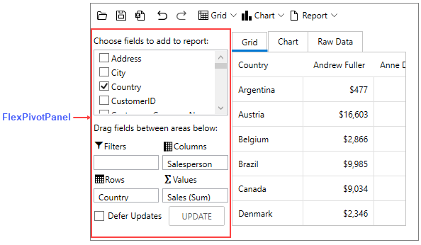 FlexPivotPanel forms the core control available with FlexPivot. The FlexPivotPanel control is designed to provide an Excel-like drag-and-drop UI that enables users to define custom views of the data. The control displays a list containing all the fields that exist in the data. Users can drag and drop these fields to lists that represent the row and column dimensions of the output table, the values summarized in the output data cells, and the fields used for filtering the data.