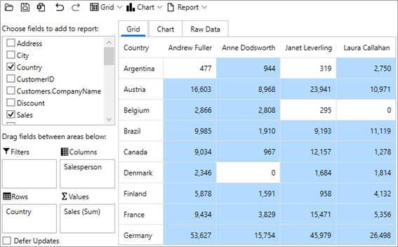 The FlexPivotGrid control derives from the FlexGrid control, so you can use the grid’s custom cells features to apply styles to cells based on their contents. The following image shows a grid where cells with values greater than 100 appear with a pastel blue background on conditional formatting. To achieve this output, use the code given below.