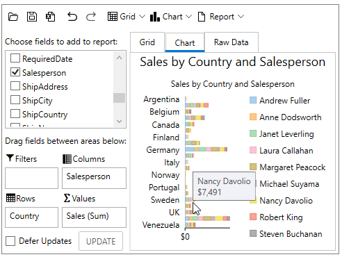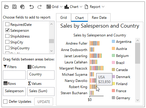 Now, you can change the view by dragging the “Salesperson” field into the “Columns” list to see a new summary, this time the chart displays sales per country by each salesperson.