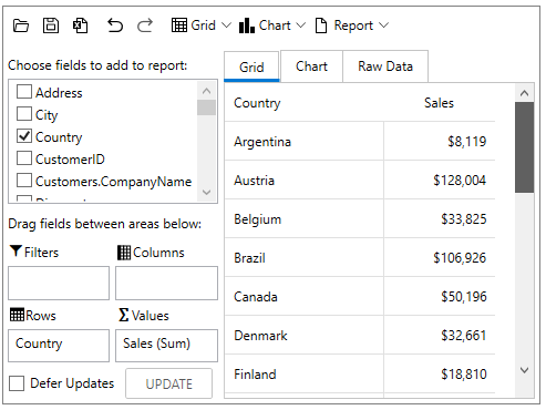 To display a view, you can run the application you created in Quick Start topic to view an interface similar to the one in Microsoft Excel. Just remove the "SalesPerson" field from the"Columns" list to see a summary of prices charged by each country as shown below: