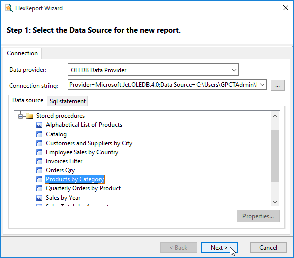 If these properties are set, C1FlexReport initializes the data source and uses them to load the data from the database automatically.