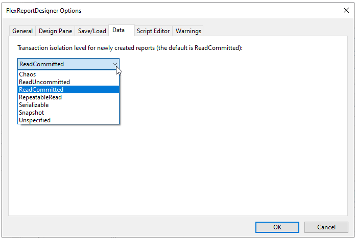 The Data tab consists of options for transaction isolation levels for newly-created reports. The default option is ReadCommitted. Learn more about transaction isolation levels here.