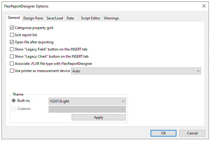 To access the FlexReportDesigner Options dialog box, click the File menu and then Options. The FlexReportDesigner Options dialog box includes five tabs to control the appearance and behavior of the application. The tabs and options available under each tab are: