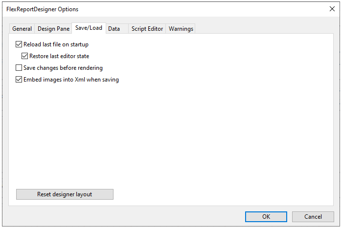 - Reload last file on startup: If this option is selected, the last opened file will appear whenever the FlexReportDesigner application is opened.