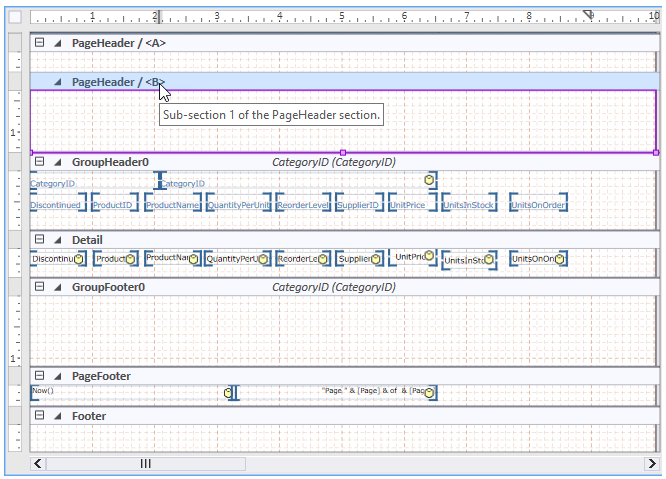 You can also add a sub-section in the Page Header section of a report programmatically. To illustrate the addition of a sub-section to an existing section like Page Header, we will be using the QuickStart sample used to create a report definition.