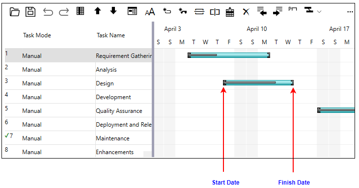 GanttView facilitates you to schedule your project from finish date or start date as per your convenience. To do so, you can use ScheduleFrom property of the Project class. After scheduling your project, you can specify the start date and finish date of your task by using Start and Finish properties of the Task class.