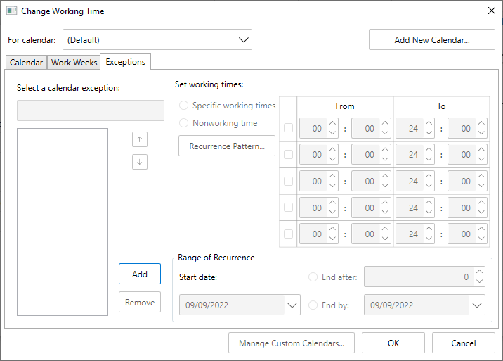 The Exceptions tab provides you the option to add exceptions in the calendar such as marking public holidays or vacation. The following image shows how this tab appears at runtime: