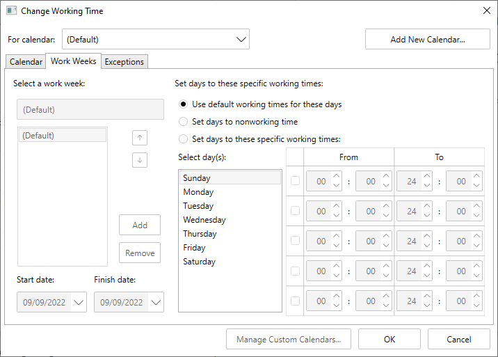 The Work Weeks tab provides option to change the default work week for project calendar, resource calendar, or for any custom calendar that you create. You can also choose or create additional schedule for a range of days that differ from the default work day.