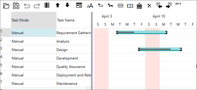 The nonworking-time denotes the time duration during which no work is being carried out, like company holidays, weekends, and so on. By default, the nonworking time line is displayed in a default color, i.e., light gray color. However, you can change the color of nonworking time line by using NonworkingTimeColor property of the C1GanttView class.