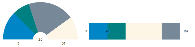 The following image depicts a Radial and Linear Gauge with multiple range regions defined using colors.