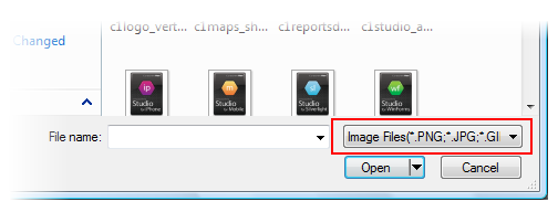Run the application and click the Browse button in the C1FilePicker control. Notice that a filter has been applied so that only files with the PNG, JPG, and GIF extensions appear in the dialog box: