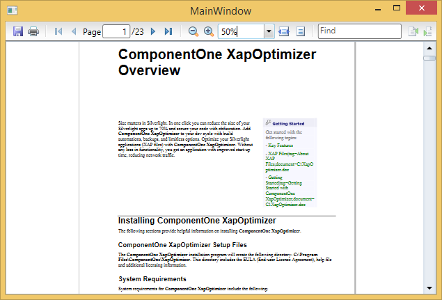 In the previous steps, you created a WPF or Silverlight application, and added the PdfViewer control and a sample PDF file to be viewed at runtime. In this step, you run the application and use the control's runtime capabilities,