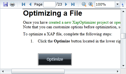 This code adds a stream and loads the stream into the C1ReportViewer control. Note that if you named the application differently, you will need to replace "QuickStart" with the name of your project. If you added a different PDF file, replace "C1XapOptimizer.pdf " with the name of your file.