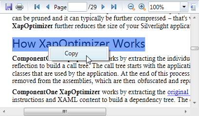 The C1ReportViewer control includes a context menu that allows you to copy content. First select the content that you want to copy and then right-click the document. A context menu will appear; by selecting Copy in the context menu you can copy the content: