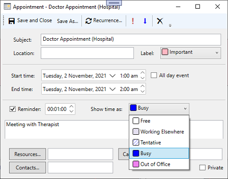 The availability status lets everyone know if you will be available at the time when an appointment is scheduled. There are four predefined availability statuses available in Scheduler: Busy, Free, Out of Office, Tentative, and Working Elsewhere. The status is specified by the following colors: