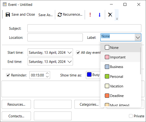 Labels can be set for any appointment at design time by selecting the desired label from the Label dropdown in the Appointment dialog as showcased in the image below.