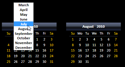 You can click the calendar month once to view calendar months. When you click once on the month name in the calendar title a popup listbox will appear with the names of the calendar months. Select the month you wish to navigate to and the calendar month will change from the current month to the selected month.