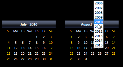 You can click the calendar year in the month title bar once to view calendar years. When you click once on the year in the calendar title a popup listbox will appear with the dates of the calendar year. Select the year you wish to navigate to and the calendar year will change from the current year to the selected year.