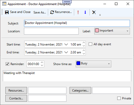 After editing all the desired fields in the dialog use the Save button on the rightmost corner of the Appointment dialog box or Ctrl+S key to update the appointment in the schedule.