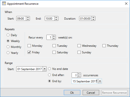 End after 0 occurrences will make the appointment recur a specified number of times. For example, if an appointment repeated every day, setting End after 25 occurrences would allow the appointment to repeat every day 25 times.