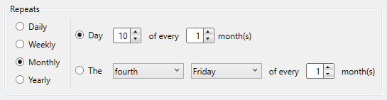Monthly | The Monthly settings allow you to repeat an appointment on every specified date at a specified interval of months or on a specified day and week of the month at a specified interval of months. |
