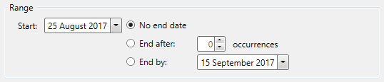 The Start drop-down calendar allows you to select the date from which the recurrence will start. There are three options to choose from for an end date: