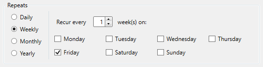 Weekly | The Weekly settings allow you to repeat the appointment on every specified week on specified days. |