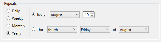 Yearly | The Yearly setting allows you to repeat an appointment on a specified date or a specified day and week of a specified month. |