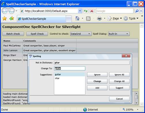 The wrapper class enumerates the grid cells and exposes the text in each cell to the C1SpellChecker component. When it finds an error, it selects the cell and the dialog box shows the error and suggestions as usual. The image below illustrates what the SpellCheckerSample sample looks like while checking the spelling in a DataGrid.