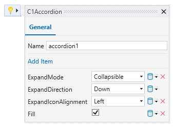 The General tab contains common and important properties specific to a control. For example, the Accordion control's Quick Suggested Actions menu provides General properties like Name, ExpandMode, ExpandDirection, Fill etc.