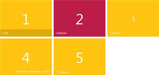 Note that the red C1SlideTile in the image above is displayed using the ContentTemplate. When the tile transitions to the BackContentTemplate, it will appear green.