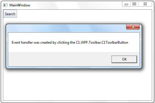 Add an attribute named Click to the C1ToolbarButton element in the XAML editor, and set its value to New Click. This is the name that you will give the event handler in code. Also give the C1ToolbarButton element a unique name and set its value to Search.