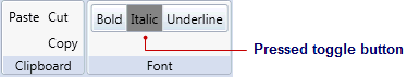 Toggle buttons display graphic or text like command buttons, but when it is pressed or activated the state appears in an on state. To indicate an on state you can set a color for the C1ToolbarToggleButton.PressedBrush property.
