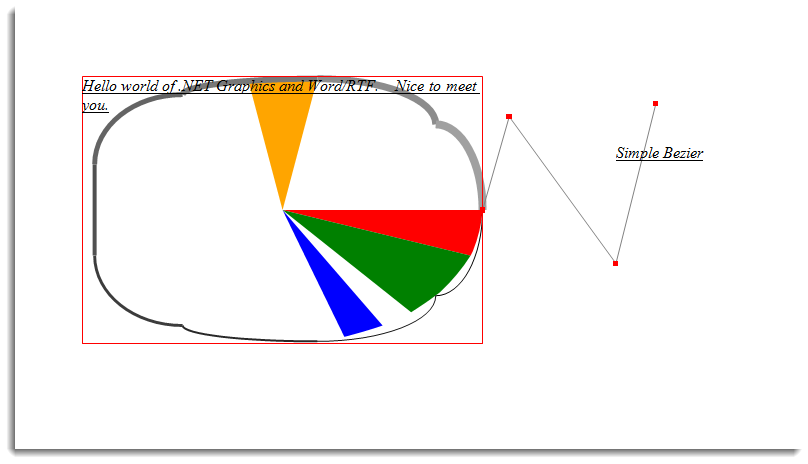 In the above code, DrawRectangle, DrawArc, DrawPolyline, and DrawBeziers methods are used to draw graphics of different types such as, line, rectangle, pie, and bezier. Besides, DrawString method is used to draw and show text in the document.