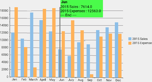 C1FlexChart enables users to show a line marker in the chart area that displays precise data values for a specific point or position. The Line Marker draws horizontal or vertical lines over the plot area with relative data values displayed near by. Users can set these lines as static or interactive by using Interaction method. To customize the direction in which the line marker displays the data values, use the Alignment method and set it to LineMarkerAlignment.Auto. You can also set the orientation of the lines using Lines method.